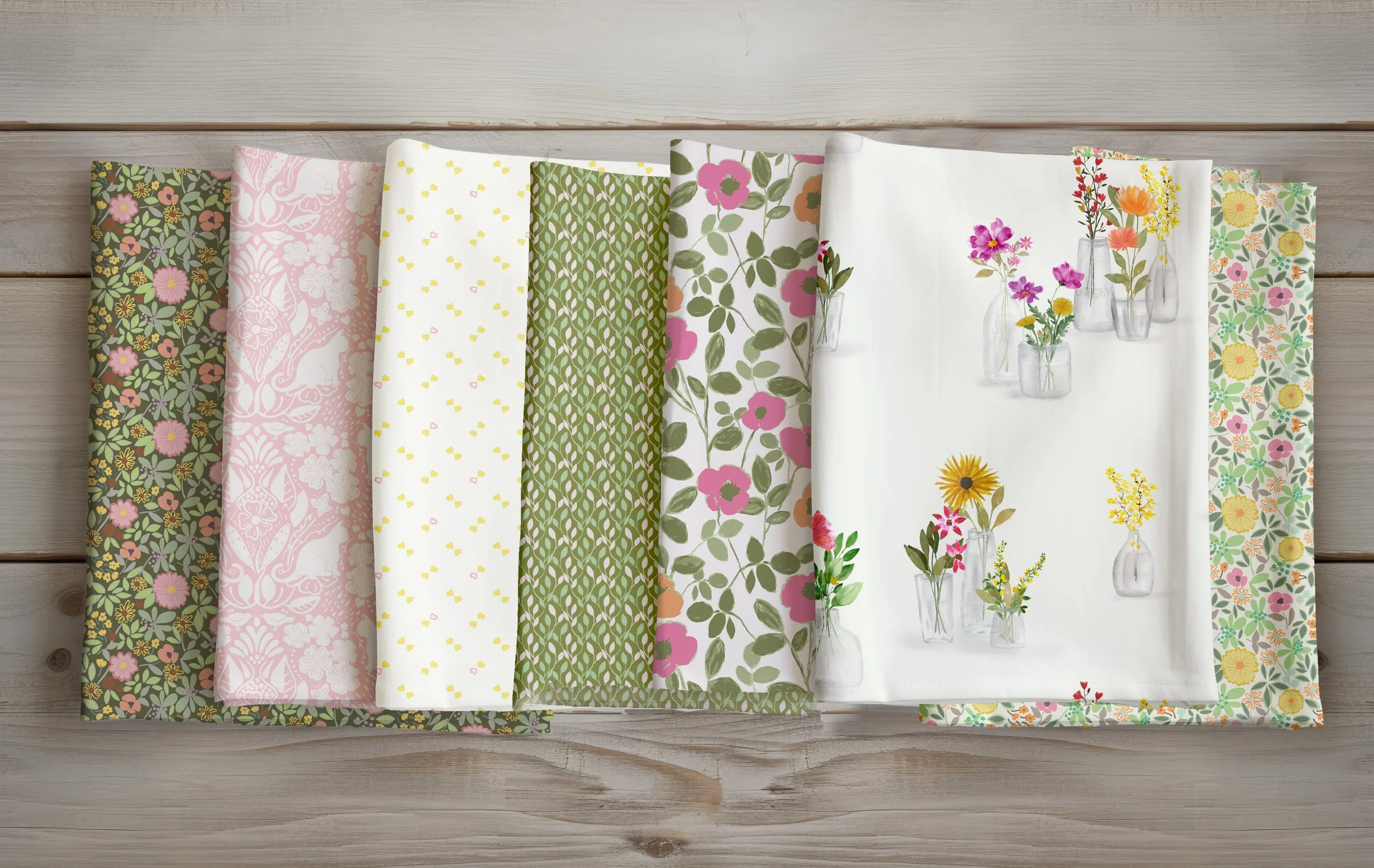 L - R: Leaf Layers, Soft Plaid, Cherry Blossoms, Little Birds, Pin Dot, Soaring, Flowergirl
