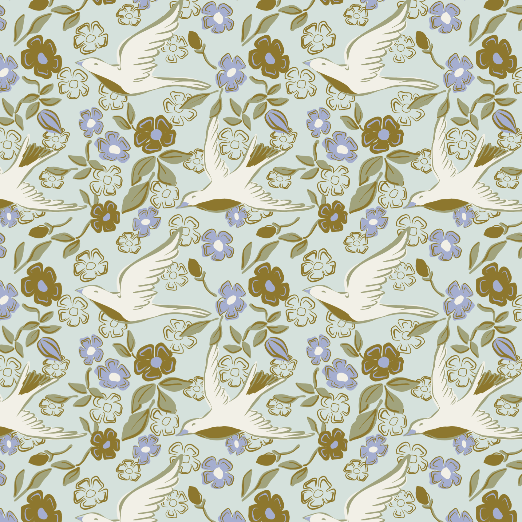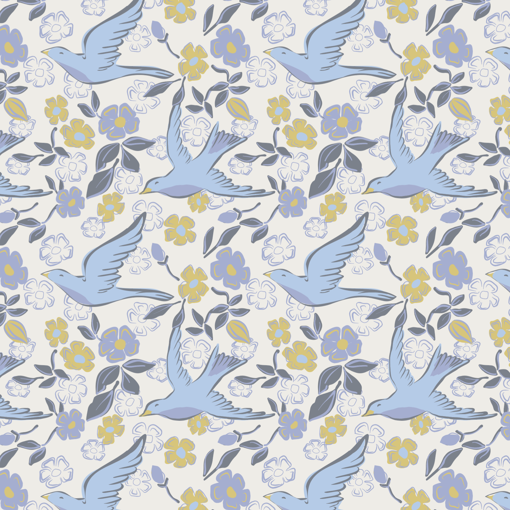 A light, uplifting botanical collection featuring graceful birds and blooming florals in a soft, optimistic palette. The collection includes scalable vector repeats and coordinating patterns designed for wallpaper, bedding, and lifestyle home products. Alternate colorways and scales available.